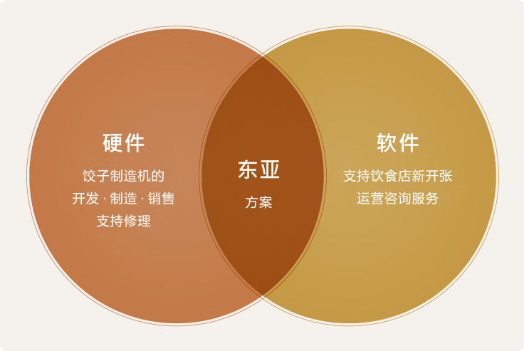 饺子,是藏有无限可能的一款产品。东亚工业是以饺子为中心的商业方式 - “东亚方案”,支持贵店的独特魅力以及创新理念。东亚方案的最大特点是,本公司也实际开店·运营饺子专门店以及饺子制造工厂,并将这些诀窍毫无保留地提供给客户。